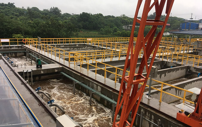 本項(xiàng)目設(shè)計(jì)規(guī)模15000噸/天,分三期實(shí)施,一期新建日處理5000噸/天污水處理廠,深度處理工藝MBR系統(tǒng)設(shè)計(jì)一期處理規(guī)模為3000噸/天,污水處理主體工藝采用A2O+MBR,出水排放標(biāo)準(zhǔn)達(dá)到《四川省岷江、沱江流域水污染排放標(biāo)準(zhǔn)》(DB51/2311-2016)合格標(biāo)準(zhǔn)。項(xiàng)目選型為水藝SMU-30A產(chǎn)品,設(shè)計(jì)平均通量為13.35L/m2/h。項(xiàng)目設(shè)計(jì)2座膜池,每座膜池布置6個(gè)膜架,每個(gè)膜架52簾SMU-30A,共用膜面積9360平方。項(xiàng)目投運(yùn)時(shí)間為2018年3月。
